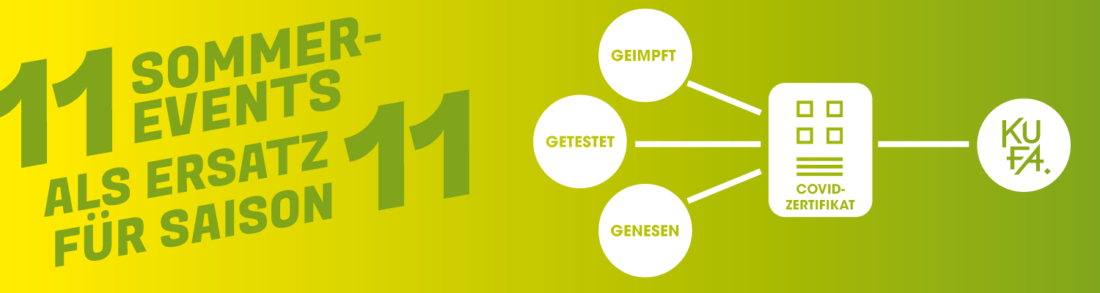 Für alle Events der kommenden Monate gilt das GGG-Prinzip (getestet, genesen, geimpft). Einlass wird nur mit einem gültigen Covid-Zertifikat gewährt. Das Zertifikat kannst du entweder ausgedruck mitbringen oder digital aus deiner App am Eingang vorweisen. Andere Bescheinigung (z.B. Testbescheinigungen, Impfausweis usw.) werden vor Ort nicht akzeptiert. Ein gültiges Zertifikat ist absolut notwendig für den Einlass an diesen Event. Alle weiteren Infos zum Schutzkonzept und dem Zertifikat auf www.kufa.ch/corona-info.